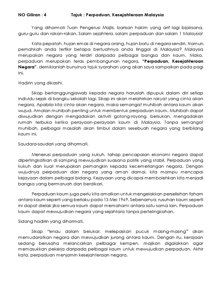 Oleh itu, semangat nasionalisme yang mendalam tanpa mengira kaum, agama dan warna kulit telah dapat dipupuk menerusi perpaduan kaum. Jelasnya, generasi muda akan sedar akan peranan mereka untuk mengukuhkan perpaduan kaum menerusi peranan yang dimainkan oleh pihak sekolah. Tajuk karangan perpaduan kaum : Bagaimanapun, perlu diingat ini akan hanya dapat dicapai sekiranya semua rakyat malaysia bersatu. Tema/tajuk:11.1 pembinaan negara dan bangsa yang merdeka soalan:sistem ahli yang diperkenalkan oleh british di tanah melayu telah men.