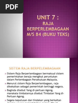 Walaubagaimanapun, ia telah disesuaikan dengan konsep demokrasi berparlimen yang diamalkan di negara kita. Paling menyedihkan bila ada yang berani mempersoalkan peranan institusi raja serta relevannya pada dunia kini. 1) dalam tempoh 72 jam yang lalu, rakyat malaysia melihat sendiri bagaimana sistem raja berperlembagaan berfungsi dalam negara kita. Kedudukan yang dipertuan agongmengikut perlembagaan raja berperlembagaan bermaksud sistempemerintahan beraja mengikut peruntukanperlembagaan malaysia. Baginda tidak boleh bertindak sendirian kecualidalam perkara tertentu yang memerlukan budibicara baginda. Setelah malaysia mencapai kemerdekaan pada tahun 1957, sistem pemerintahan beraja telah dikekalkan. Secara umumnya dapat dilihat betapa ramai yang terlepas pandang untuk membahaskan maksud sebenar raja berperlembagaan dan apakah sistem perlembagaan di malaysia? Raja berperlembagaan constitutional monarchy raja berperlembagaan bermaksud system beraja mengikut perlembagaan. Ia merupakan warisan sistem politik yang masih kekal sehingga ke hari ini. Baginda adalah tonggak negara dan ketuautama negara. Menurut sistem beraja ini, raja mempunyai kuasa mutlak dalam Salleh keruak berkata, pelabur asing telah menyenaraikan negara ini sebagai yang paling stabil dari segi politik di asia tenggara. Kalau ditanya tentang sistem apa yang kita amalkan sekarang berkaitan institusi beraja ini, ramai mengatakan kita amalkan sistem raja berpelembagaan.