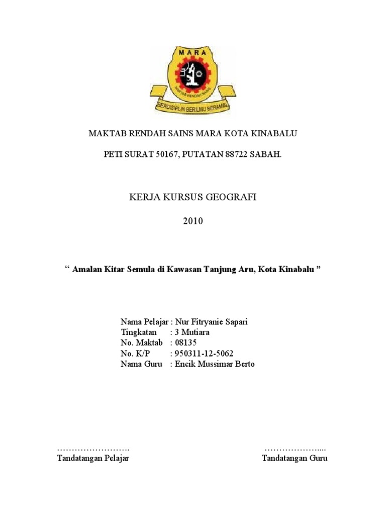 Makalah berikut ini memberikan pembahasan geografi dari segi konsep, objek, ruang lingkup, dan manfaatnya. Pelajar dikehendaki membuat kerja kursus geografi pt3 dengan sendiri tanpa meniru atau plagariat. Bagi memenuhi keperluan penilaian menengah rendah 2013, saya selaku pelajar tingkatan 3 diwajibkan melaksanakan kerja kursus geografi di sekolah. Kerja kursus ini juga memberi peluang kepada saya untuk menguasai kemahiran membuat penyeledikan dengan tatacara yang betul serta dapat menigkatkan kemahiran berkomunikasi. Contoh jawapan tugasan kerja kursus geografi pt3 2018 akan dikongsikan dari masa kesemasa. Ini sumber bukan internet dan ini adalah satu jenis. Bagi memenuhi keperluan ini saya dengan penuh yakin memilih kawasan kediaman saya iaitu kampung sentol patah. Folio kerja kursus geografi tingkatan dua 2. Lulusan geografi biasanya terlibat dalam riset, penelitian lapangan dan menulis laporan. Jika anda mahu mengambil entry ini sebagai contoh, sila tukar dan ikut keadaan pengangkutan anda di kawasan anda. Cikgu nurul semekar 4 months ago. Ingin mempelajari geografi secara lengkap? Kerja kursus / folio geografi (tingkatan 3) pmr 2013.